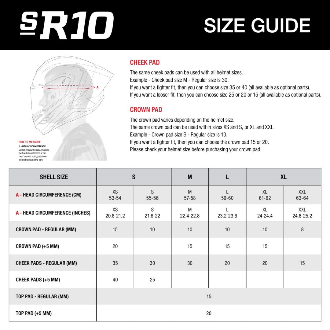 - The S-R10 has four inner shells just like the outer shell and is available in four anatomical sizes. The S-R10’s construction is optimized to ensure riders have the correct fit, which not only improves comfort and reduces overall weight, but most importantly, improves the effectiveness of the helmet in an impact. Underneath the helmet’s outer shell is an eight-piece multi-density EPS liner, with six specific densities that are strategically positioned in different zones to ensure excellent energy absorption from impact forces dissipated over the outer shell, as well as a close and comfortable fit. The EPS liner, just like the outer shell, has its own unique dimension for each helmet size, further tailoring the helmet’s performance and fit when it comes to protection and comfort.