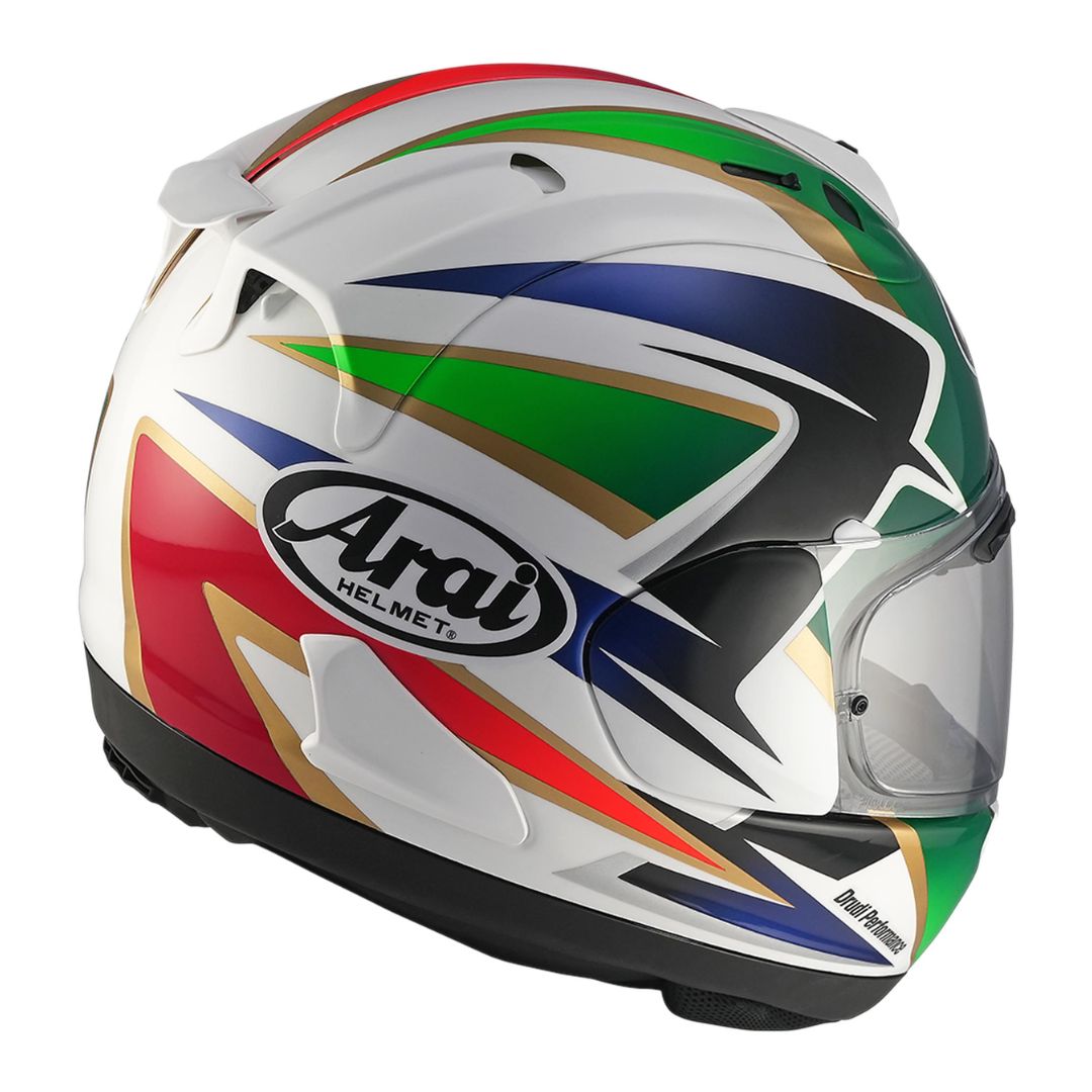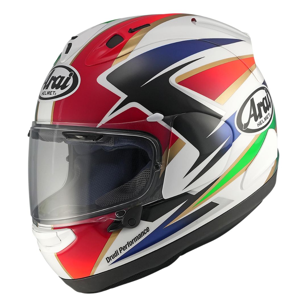 The RX-7V EVO is the advanced evolution of the RX-7V and meets the significantly stricter ECE 22.06 requirements without compromising Arai’s core principles of a rounder, smoother, and stronger helmet shell. This construction optimizes the Glancing-Off performance and delivers maximum safety for both racetrack and road use. The updated interior features the new Eco Pure material, offering a softer feel, improved hygiene, and a fully removable and washable design. Revised cheek pads with rear hook attachments allow easier removal, while newly positioned ventilation channels manage airflow more efficiently. The scratchproof VAS MAX Vision visor provides an expanded field of view and is supplied with a Pinlock® lens for clear vision in all conditions. With its precise Double-D ring closure, refined aerodynamics, integrated brain protection system, and preparation for communication systems, the RX-7V EVO meets the demands of performance-focused sport and touring riders alike, setting new benchmarks in safety, aerodynamics, and comfort for uncompromising road and track riding.