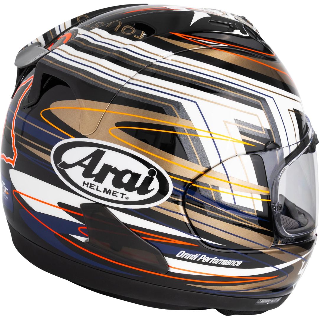 Experience the thrill of the Isle of Man TT with the Arai RX-7V EVO IoM TT 2026 Limited Edition. Designed around the legendary road race, where Arai has been the Official Helmet Partner for decades, this 17th special edition celebrates speed, precision, and racing heritage. With its striking retro-inspired livery in black, white, and gold, accented by vibrant red, orange, and blue highlights, the helmet captures the adrenaline of one of the world’s most iconic races.
